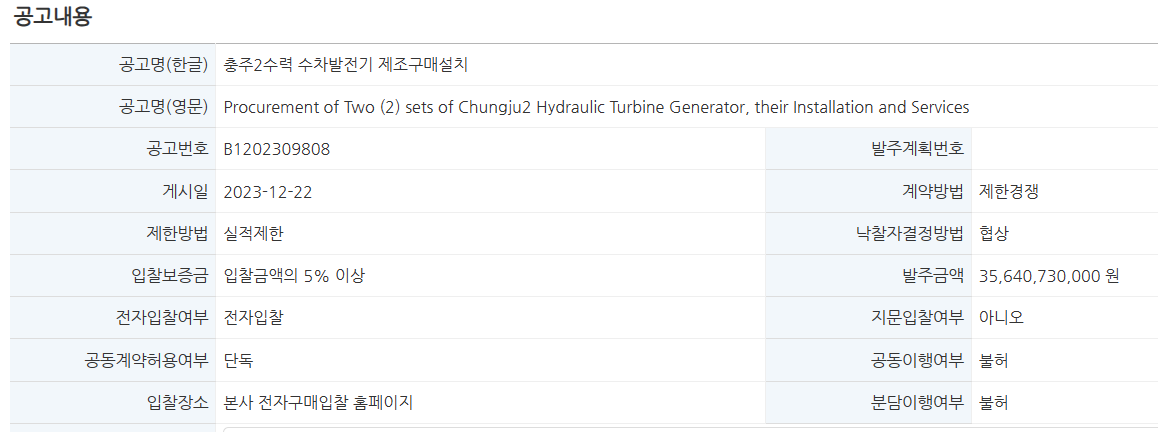 (재입찰)충주 2수력(6MW*2Units) 현대화 프로젝트(한국수자원공사, K-water 발주)
